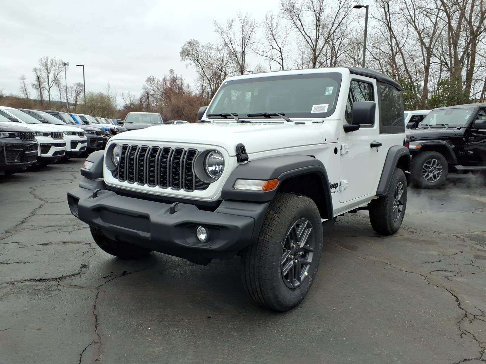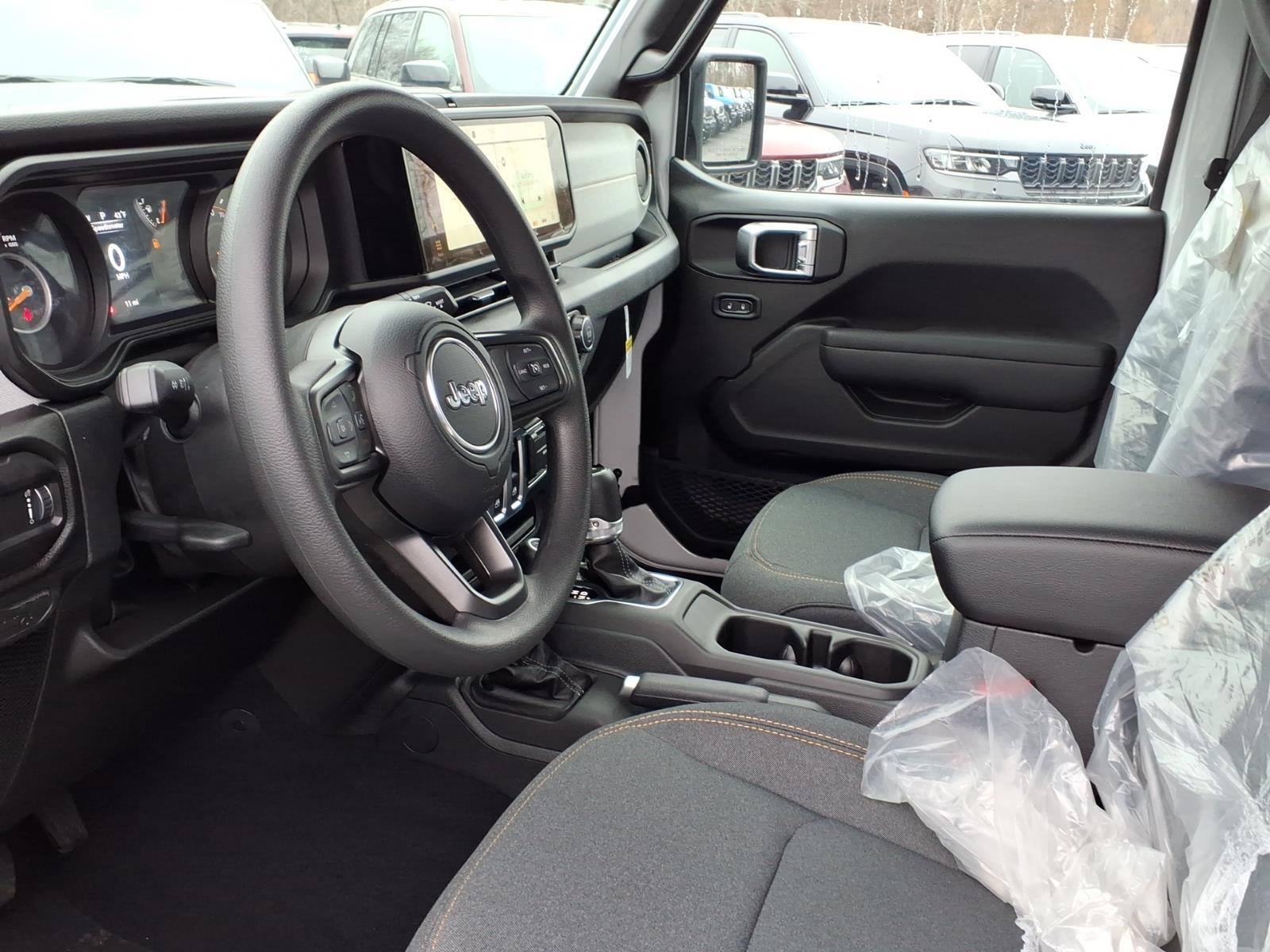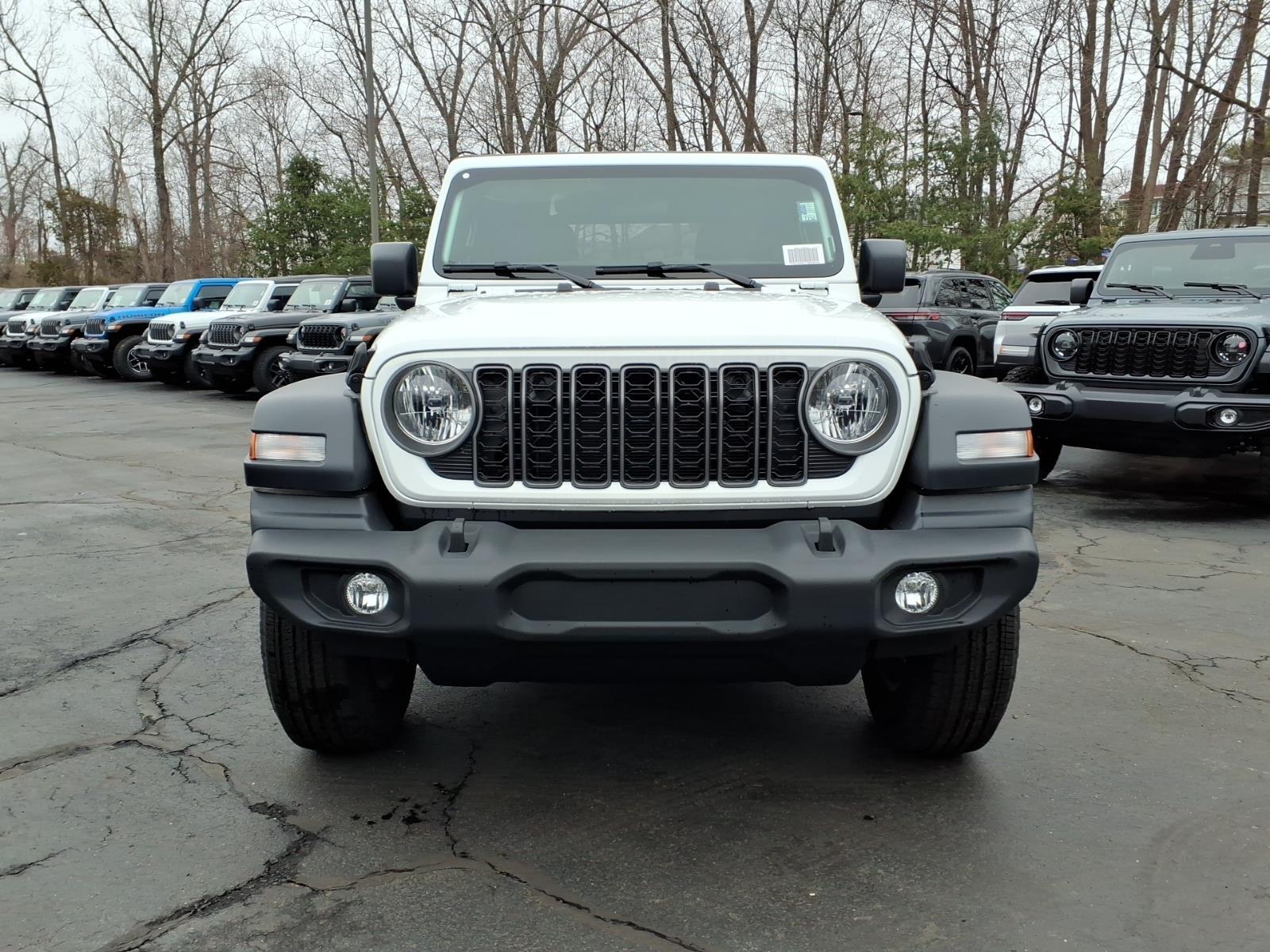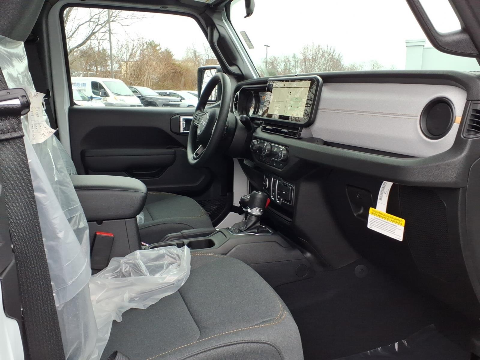 bright white clearcoat 2026 Jeep Wrangler Sport 4WD 8-Speed Automatic 2.0L I4 DOHC 12.3Touchscreen Display, 3.45 Overall Top Gear Ratio, 4-Wheel Disc Brakes, 4G LTE Wi-Fi Hot Spot, 8 Speakers, ABS brakes, Air Conditioning, AM/FM radio: SiriusXM with 360L, Apple CarPlay, Apple CarPlay/Android Auto, Aux Battery, Brake assist, Cloth Low-Back Bucket Seats, Compass, Connectivity - US/Canada, Deep Tint Sunscreen Windows, Delay-off headlights, Driver door bin, Driver vanity mirror, Dual front impact airbags, Dual front side impact airbags, Electronic Stability Control, For More Info, Call 800-643-2112, Front anti-roll bar, Front Bucket Seats, Front Center Armrest w/Storage, Front fog lights, Front reading lights, Google Android Auto, Illuminated entry, Integrated Center Stack Radio, Integrated roll-over protection, Low tire pressure warning, MOPAR All-Weather Floor Mats, Myflexcare Service Plan, Non-Lock Fuel Cap Without Discriminator, Normal Duty Suspension, Occupant sensing airbag, Outside temperature display, Overhead airbag, Panic alarm, ParkView Rear Back-Up Camera, Passenger door bin, Power steering, Power windows, Quick Order Package 22B Sport, Radio data system, Radio: Uconnect 5 with 12.3Display, Rear anti-roll bar, Remote keyless entry, SiriusXM with 360L, Speed control, Steering wheel mounted audio controls, Stop-Start Dual Battery System, Tachometer, Telescoping steering wheel, Tilt steering wheel, Traction control, Trip computer, Variably intermittent wipers, Wheels: 17x 7.5Gray.