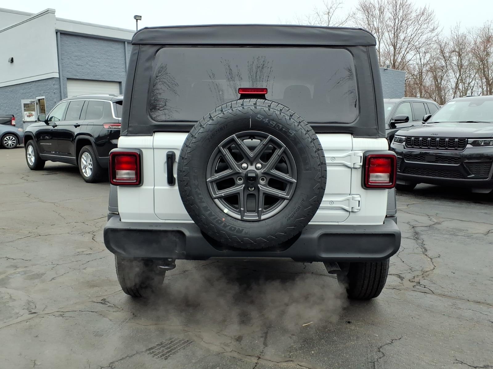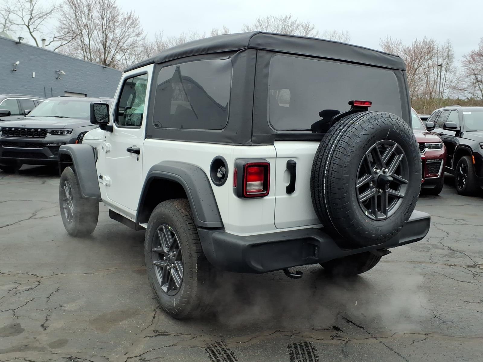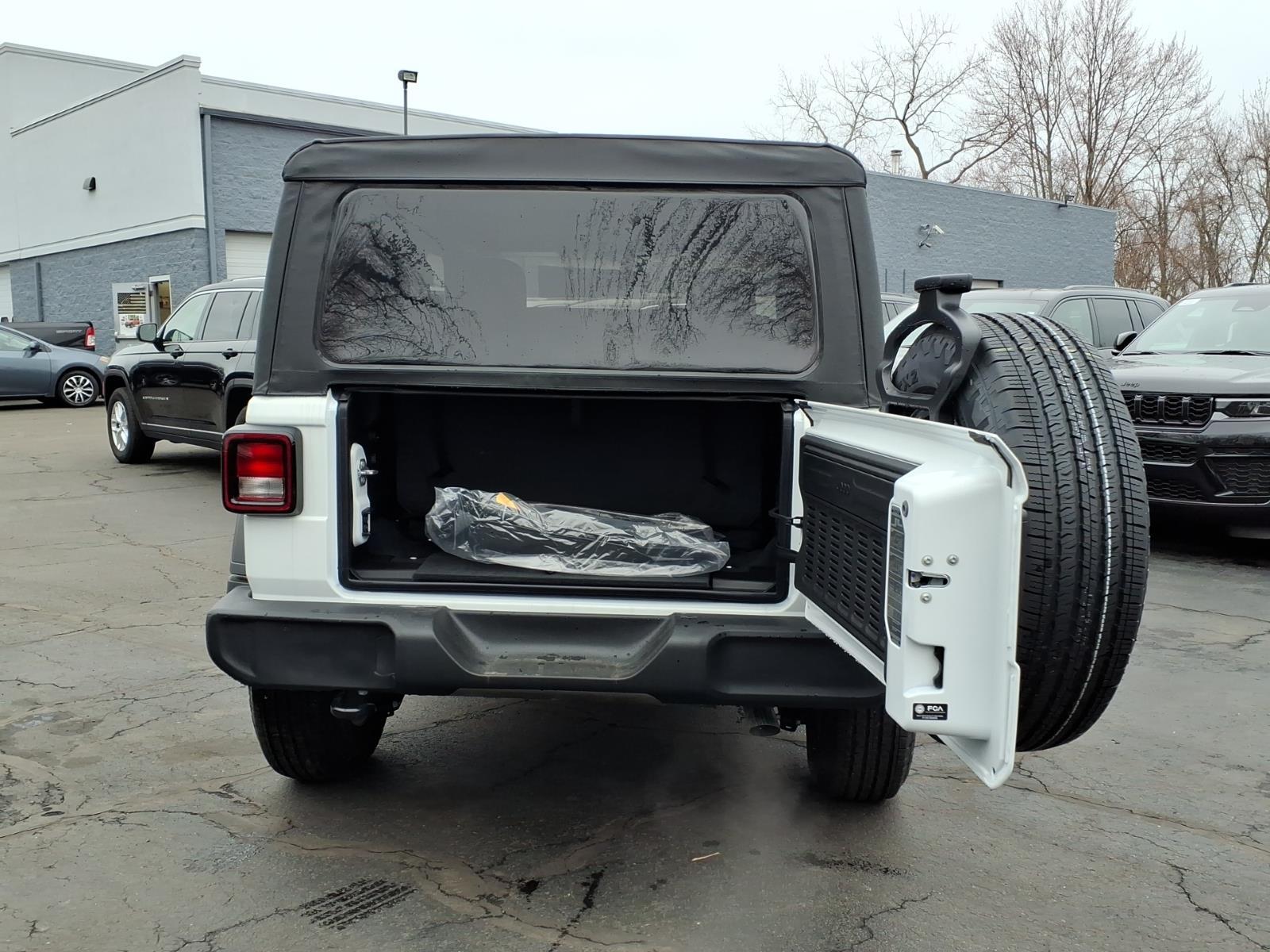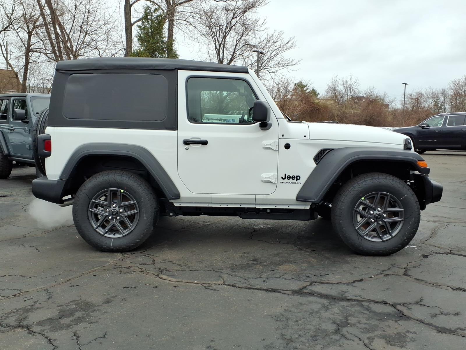 bright white clearcoat 2026 Jeep Wrangler Sport 4WD 8-Speed Automatic 2.0L I4 DOHC 12.3Touchscreen Display, 3.45 Overall Top Gear Ratio, 4-Wheel Disc Brakes, 4G LTE Wi-Fi Hot Spot, 8 Speakers, ABS brakes, Air Conditioning, AM/FM radio: SiriusXM with 360L, Apple CarPlay, Apple CarPlay/Android Auto, Aux Battery, Brake assist, Cloth Low-Back Bucket Seats, Compass, Connectivity - US/Canada, Deep Tint Sunscreen Windows, Delay-off headlights, Driver door bin, Driver vanity mirror, Dual front impact airbags, Dual front side impact airbags, Electronic Stability Control, For More Info, Call 800-643-2112, Front anti-roll bar, Front Bucket Seats, Front Center Armrest w/Storage, Front fog lights, Front reading lights, Google Android Auto, Illuminated entry, Integrated Center Stack Radio, Integrated roll-over protection, Low tire pressure warning, MOPAR All-Weather Floor Mats, Myflexcare Service Plan, Non-Lock Fuel Cap Without Discriminator, Normal Duty Suspension, Occupant sensing airbag, Outside temperature display, Overhead airbag, Panic alarm, ParkView Rear Back-Up Camera, Passenger door bin, Power steering, Power windows, Quick Order Package 22B Sport, Radio data system, Radio: Uconnect 5 with 12.3Display, Rear anti-roll bar, Remote keyless entry, SiriusXM with 360L, Speed control, Steering wheel mounted audio controls, Stop-Start Dual Battery System, Tachometer, Telescoping steering wheel, Tilt steering wheel, Traction control, Trip computer, Variably intermittent wipers, Wheels: 17x 7.5Gray.