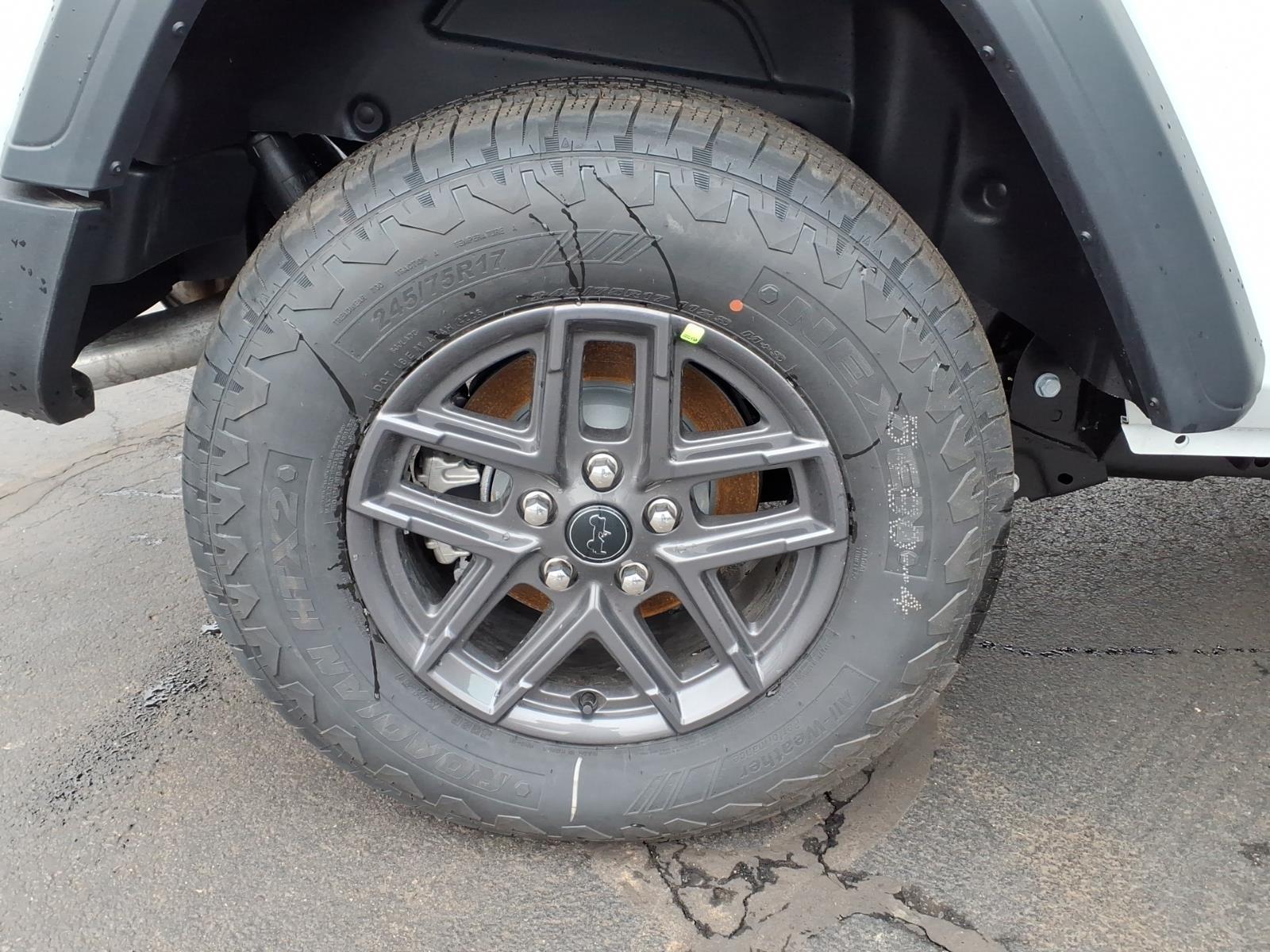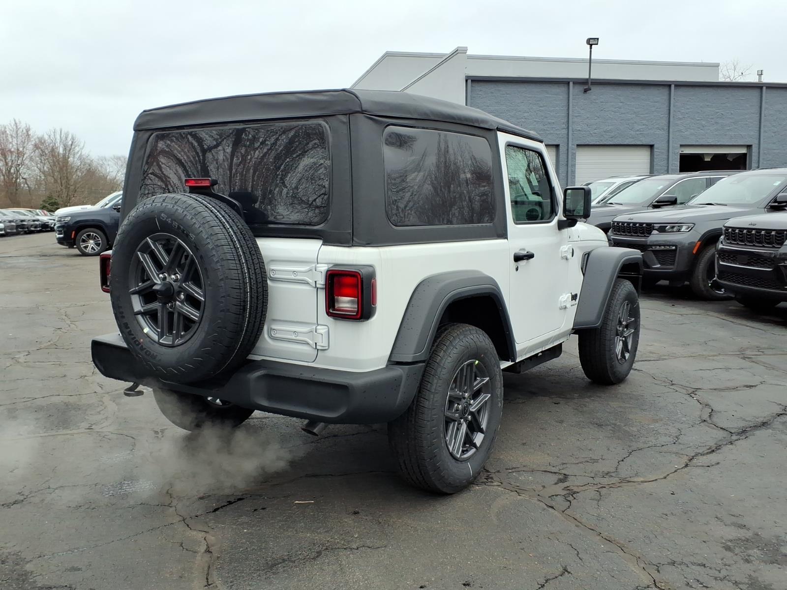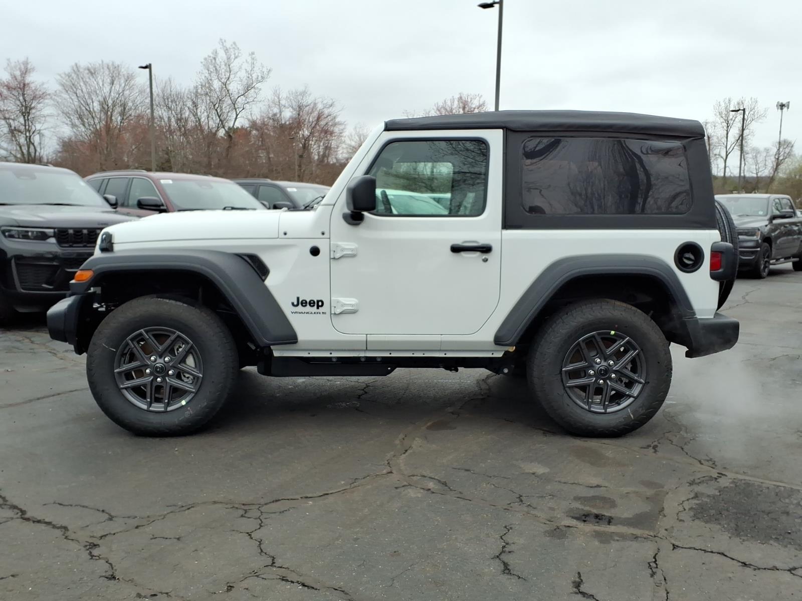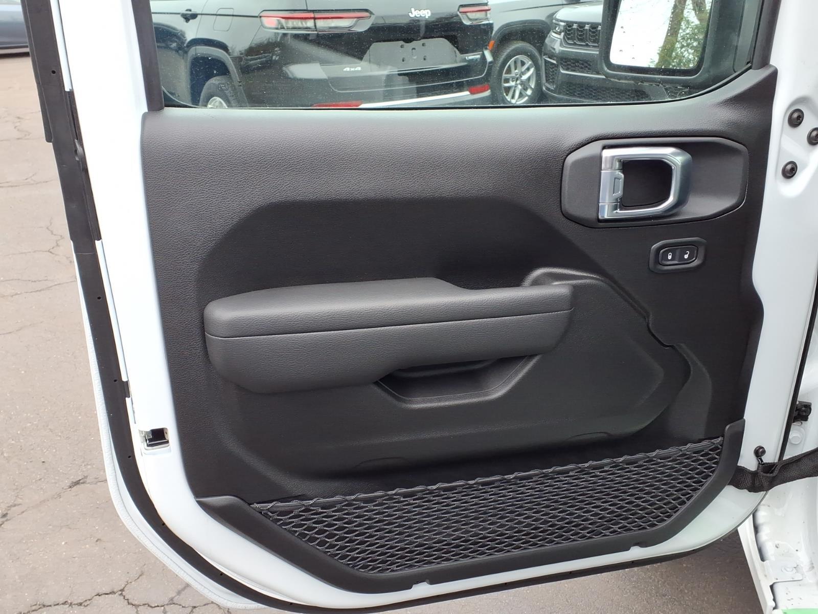 bright white clearcoat 2026 Jeep Wrangler Sport 4WD 8-Speed Automatic 2.0L I4 DOHC 12.3Touchscreen Display, 3.45 Overall Top Gear Ratio, 4-Wheel Disc Brakes, 4G LTE Wi-Fi Hot Spot, 8 Speakers, ABS brakes, Air Conditioning, AM/FM radio: SiriusXM with 360L, Apple CarPlay, Apple CarPlay/Android Auto, Aux Battery, Brake assist, Cloth Low-Back Bucket Seats, Compass, Connectivity - US/Canada, Deep Tint Sunscreen Windows, Delay-off headlights, Driver door bin, Driver vanity mirror, Dual front impact airbags, Dual front side impact airbags, Electronic Stability Control, For More Info, Call 800-643-2112, Front anti-roll bar, Front Bucket Seats, Front Center Armrest w/Storage, Front fog lights, Front reading lights, Google Android Auto, Illuminated entry, Integrated Center Stack Radio, Integrated roll-over protection, Low tire pressure warning, MOPAR All-Weather Floor Mats, Myflexcare Service Plan, Non-Lock Fuel Cap Without Discriminator, Normal Duty Suspension, Occupant sensing airbag, Outside temperature display, Overhead airbag, Panic alarm, ParkView Rear Back-Up Camera, Passenger door bin, Power steering, Power windows, Quick Order Package 22B Sport, Radio data system, Radio: Uconnect 5 with 12.3Display, Rear anti-roll bar, Remote keyless entry, SiriusXM with 360L, Speed control, Steering wheel mounted audio controls, Stop-Start Dual Battery System, Tachometer, Telescoping steering wheel, Tilt steering wheel, Traction control, Trip computer, Variably intermittent wipers, Wheels: 17x 7.5Gray.