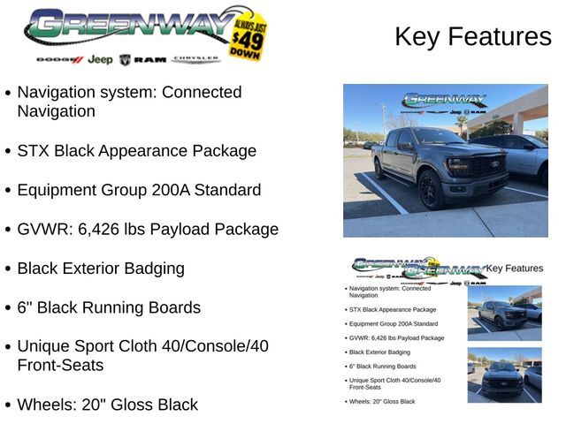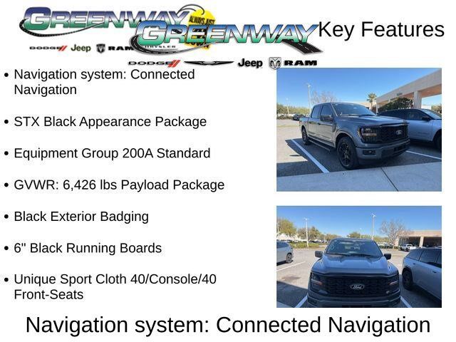 - STX Black Appearance Package: Includes Black Exterior Badging, 6" Black Running Boards, and Gloss Black 20" Wheels- Equipment Group 200A Standard: GVWR: 6,426 lbs Payload Package- Unique Sport Cloth 40/Console/40 Front-Seats- Navigation system: Connected Navigation- 6" Black Running Boards- Black Exterior Badging- Wheels: 20" Gloss BlackUnder the hood, this F-150 STX is powered by a potent 2.7L V6 EcoBoost engine, delivering an impressive balance of power and efficiency. With 10-speed automatic transmission and rear-wheel drive, you'll enjoy a smooth, responsive ride whether you're hauling heavy loads or tackling the open road.The interior of the F-150 STX is designed with your comfort and convenience in mind. Enjoy features like SYNC 4 with Enhanced Voice Recognition, a rearview camera, and a host of advanced safety technologies, including Automatic High-Beam Headlights, Brake Assist, and Electronic Stability Control.Whether you're a contractor, a weekend warrior, or simply someone who demands the best from their truck, the 2024 Ford F-150 STX is the perfect choice. With its rugged good looks, impressive capabilities, and host of premium features, this truck is ready to take on any challenge you throw its way.We're confident that once you experience the power, versatility, and premium amenities of the F-150 STX, you'll be convinced that it's the perfect truck for your needs. Visit our showroom today and let us put you behind the wheel for a test drive. We're confident you'll be impressed by everything this remarkable vehicle has to offer.