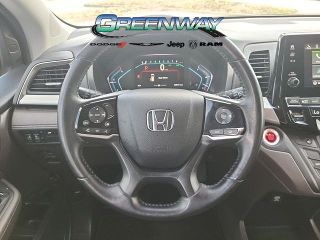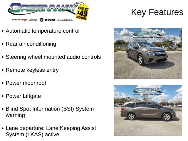 - Automatic temperature control- Rear air conditioning- Remote keyless entry- Steering wheel mounted audio controls- Power moonroof- Power Liftgate- Blind Spot Information (BSI) System warning- Forward collision: Collision Mitigation Braking System (CMBS) FCW mitigation- Lane departure: Lane Keeping Assist System (LKAS) active- Exterior Parking Camera Rear- Fully automatic headlights- Apple CarPlay/Android Auto- Leather Seat Trim- Wheels: 18" Dark Silver-Painted AlloyPowered by a robust 3.5L V6 SOHC i-VTEC 24V engine paired with a smooth-shifting 9-Speed Automatic transmission, this Odyssey delivers an impressive balance of performance and efficiency, with an EPA-estimated 19 city/28 highway mpg.Beyond its impressive powertrain, this Odyssey EX-L is packed with thoughtful features that cater to your family's needs. Enjoy the convenience of a power liftgate, remote keyless entry, and steering wheel-mounted controls. Stay connected with Apple CarPlay and Android Auto, while the Blind Spot Information System and Collision Mitigation Braking System provide added peace of mind on the road.Slip into the luxurious leather-trimmed seats and experience the comfort of dual-zone automatic climate control and a power-adjustable driver's seat. The spacious interior offers seating for up to eight, with the flexibility of a split-folding third-row seat for versatile cargo-carrying capabilities.Whether you're shuttling the kids to school, embarking on a family road trip, or simply running errands, this 2019 Honda Odyssey EX-L is the perfect companion to elevate your daily drives. Schedule a test drive today and discover the exceptional value and capabilities this minivan has to offer.